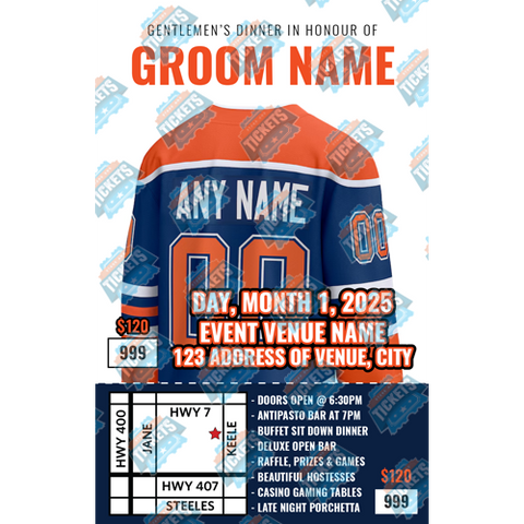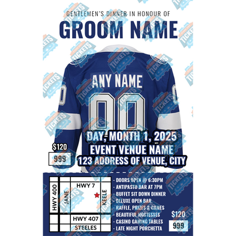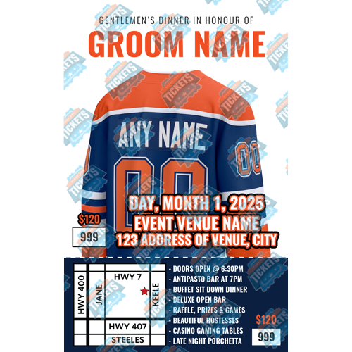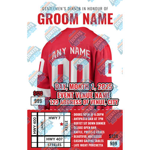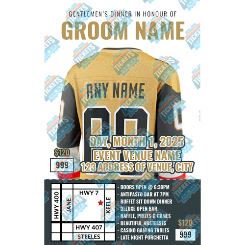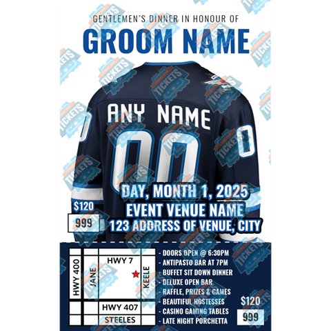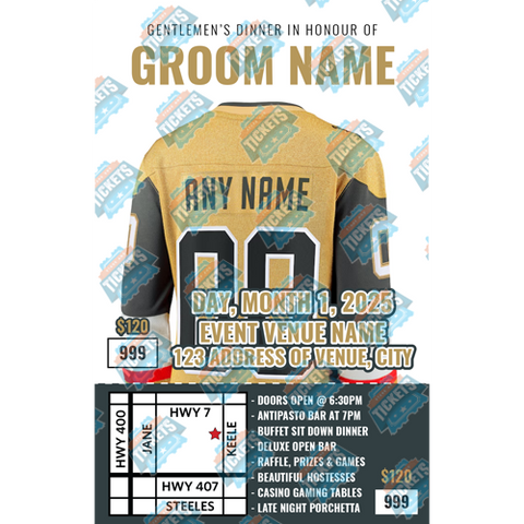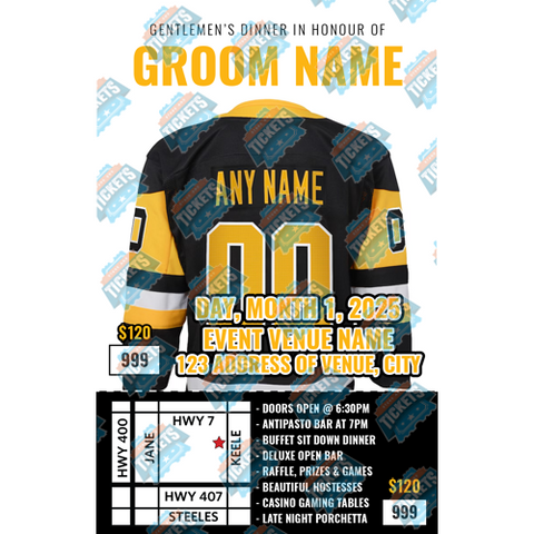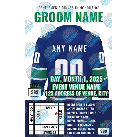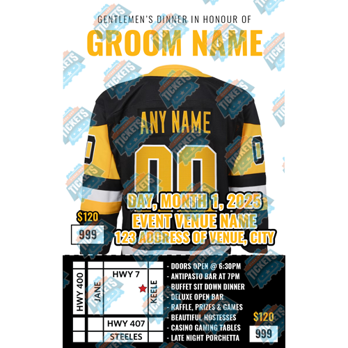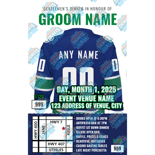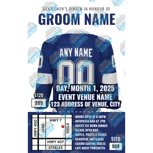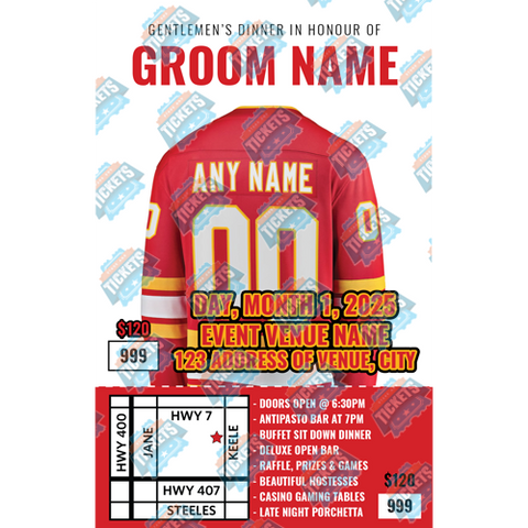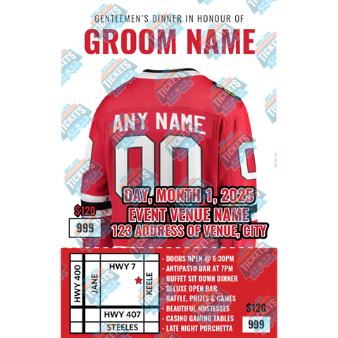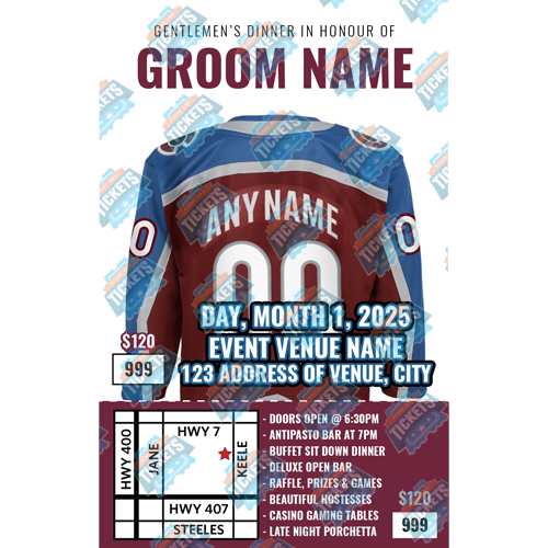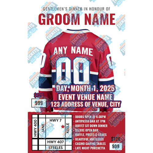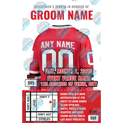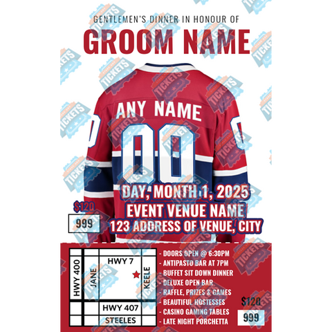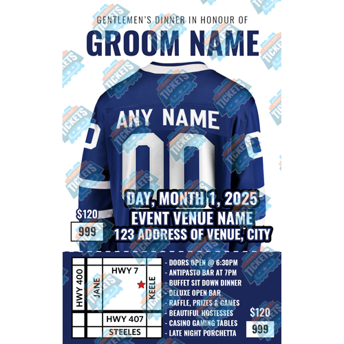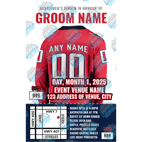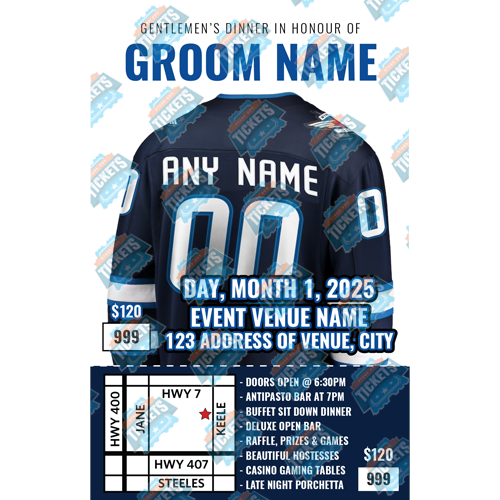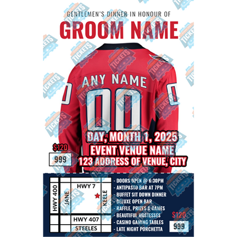 Have a favourite Hockey Player? Want to see your name on the back of their jersey? We can do this for any team, any jersey. Indicate which player, team and jersey colour you prefer and we'll swap his name out for yours! Number swap also available. Printed Size: 3.5" x 5.5". Example photos are: Toronto Maple Leafs, Calgary Flames, Chicago Blackhawks, Colorado Avalanche, Detroit Red Wings, Edmonton Oilers, Montreal Canadiens, Pittsburgh Penguins, Tampa Bay Lightning, Vancouver Canucks, Vegas Golden Knights, Washington Capitals and Winnipeg Jets. This ticket design is NOT limited to these teams; you may choose any team, and any variation of their jersey... home, away or alternate!