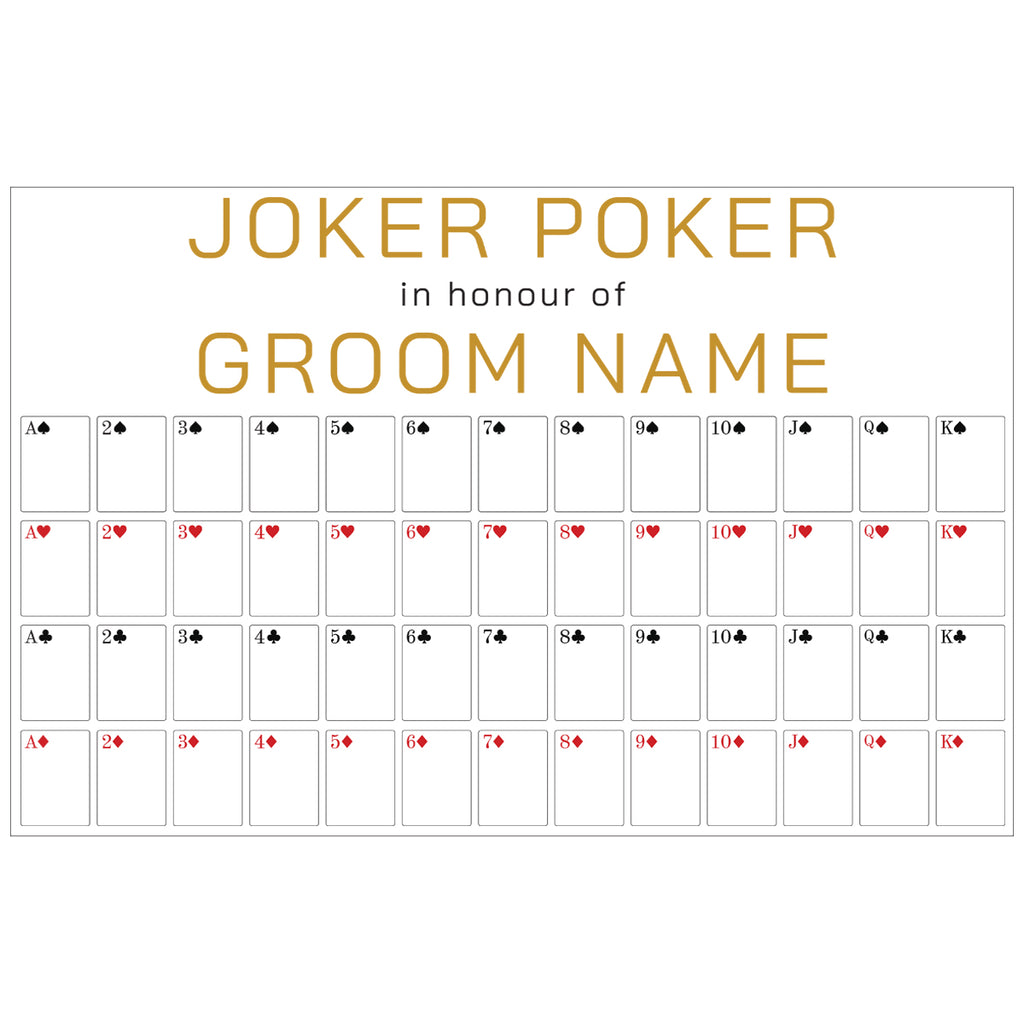 Rather than printing a "joker" on the back of the board, this design randomizes the spot by printing the 52-card deck in a grid, and then randomly drawing a card out of a sealed deck of cards. Whichever card you draw would be matched up with the Joker Poker board and whomever wrote their name in that spot would be the winner.
