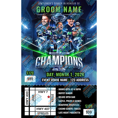The Seattle Seahawks capped off their 2025-2026 NFL season with a historic and dominant run, finishing the regular season with a franchise-best 14-3 record to claim the NFC West title and the NFC's No. 1 seed. Under head coach Mike Macdonald, the team showcased a balanced attack led by quarterback Sam Darnold, who threw for over 4,000 yards, running back Kenneth Walker III, who rushed for more than 1,000 yards and earned Super Bowl MVP honors, and wide receiver Jaxon Smith-Njigba, who set franchise records with 119 receptions and 1,793 receiving yards. The defense, nicknamed the "Dark Side," was ferocious, featuring standouts like linebacker Ernest Jones IV, cornerback Devon Witherspoon, and edge rusher Derick Hall, contributing to a strong overall performance. The Seahawks powered through the playoffs with decisive wins—a 41-6 divisional rout of the San Francisco 49ers, a thrilling 31-27 NFC Championship victory over the Los Angeles Rams—and clinched their second Super Bowl championship by defeating the New England Patriots 29-13 in Super Bowl LX, marking the greatest season in franchise history and setting numerous team records for wins, points scored, and point differential. Celebrate the season and Super Bowl victory with our Seattle Seahawks 2026 Super Bowl Champs Stag Ticket! Printed Size: 3.5" x 5.5"